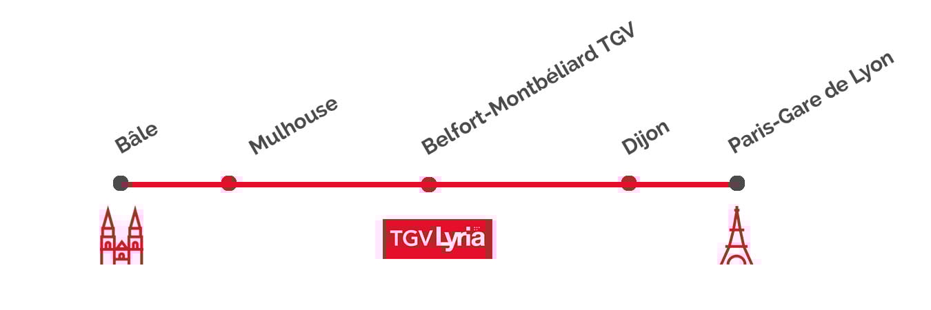 Entre Bâle et Paris, le TGV Lyria dessert la ville de Mulhouse puis s’arrête à Belfort-Montbéliard TGV et Dijon en fonction du train choisi.